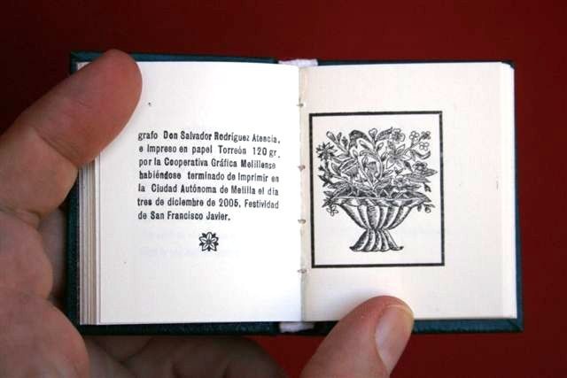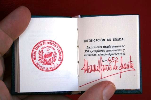 In Spanish and English text. Printed with mobile typography of 6 points in the Cooperativa Gráfica Melillense. Limited edition of 500 copies, numbered and signed by the editor. Nice binding full leather with nerves, with gilts in the planes and spine.