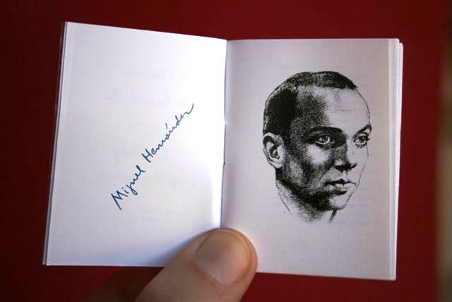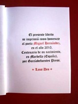It reproduces a well-known poem by Miguel Hernández, with portrait, his signature and a small biography of the famous Spanish poet. Commemorative edition of the Centenary of his birth. Bilingual text in Spanish and English. Without pagination. Bound in transparent acetate with the figure of an onion crying.