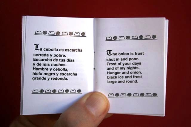 Reproduce un conocido poema de Miguel Hernández, con el retrato y una pequeña biografía del famoso poeta español. Edición conmemorativa del Centenario de su nacimiento. Texto bilingüe en español y en inglés. Sin paginar. Encuadernado en acetato transparente con la figura de una cebolla llorando.