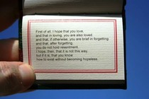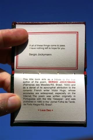 Recoge un bonito poema atribuido erróneamente a Víctor Hugo. Texto en español y en inglés. Impreso a dos tintas sobre papel verjurado gris, en edición limitada de 100 ejemplares numerados y firmados por el editor.Preciosa encuadernación en plena piel con mosaicos y caja protectora.